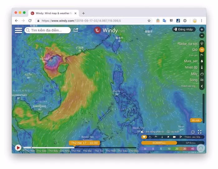 Giao diện chính của ứng dụng sẽ hiển thị tâm bão và các thông tin liên quan như sức gió, lượng mưa, nhiệt độ… Dựa vào thang đo ở góc phải, người dùng có thể tự phân tích tình hình thời tiết tại khu vực đang sinh sống. Trong phần menu của Windy, bạn có thể thay đổi thông tin cần theo dõi như nhiệt độ, mây-mưa, sóng, áp suất… Để theo dõi đường đi của siêu bão trong những ngày tiếp theo, bạn chỉ cần bấm vào thanh thời gian ở dưới màn hình.