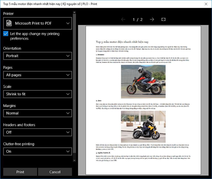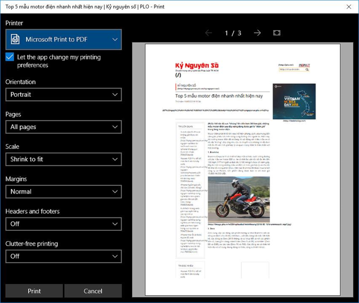 Đầu tiên, bạn hãy mở bài viết cần in bằng trình duyệt Microsoft Edge, nhấn vào biểu tượng ba chấm ở góc trên bên phải và chọn Print hoặc nhấn tổ hợp phím Ctrl + P. Tại màn hình xem trước bản in (Print preview), bạn sẽ thấy xuất hiện thêm tùy chọn Clutter-free printing ở ngay bên dưới, mặc định tính năng này sẽ chưa được kích hoạt. Bản in lúc này trong khá rối rắm vì dính nhiều thành phần dư thừa.