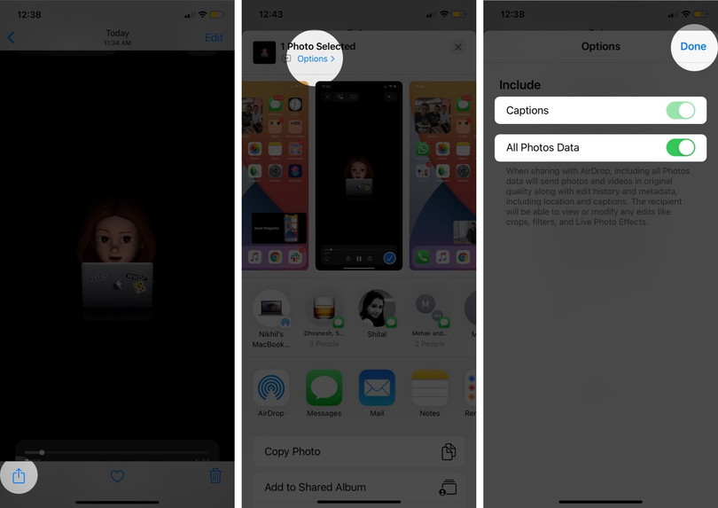 Bạn cũng có thể chia sẻ ảnh kèm chú thích qua AirDrop. Chọn ảnh, bấm nút Share (Chia sẻ), sau đó bấm nút Options (Tùy chọn) ở trên cùng của trang chia sẻ. Tại đây, bạn bật công tắc nằm bên cạnh tùy chọn Captions (Chú thích) và All Photos Data (Tất cả dữ liệu ảnh).