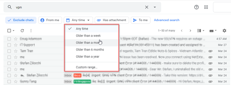 Mặc định, bộ lọc này cho phép bạn lọc các email trong khoảng thời gian từ một tuần đến một năm trở lại đây.