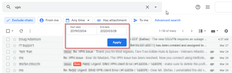Trường hợp, bạn chỉ cần tìm email bạn gửi hoặc nhận trong một khoảng thời gian nhất định nào đó, bạn có thể sử dụng bộ lọc Date.