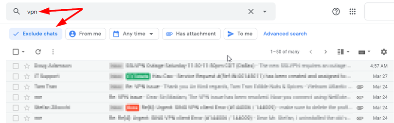 Bạn có thể thu hẹp phạm vi của kết quả tìm kiếm bằng cách chọn các bộ lọc từ thanh bộ lọc Seach Chips. Ví dụ, nếu bạn muốn loại bỏ những cuộc hội thoại qua Hangouts khỏi kết quả tìm kiếm, bạn chỉ việc chọn Exclude chats. Như bạn có thể thấy trong hình dưới so với hình ở Bước 1, biểu tượng hình dấu nháy đôi của của Hangouts đã biến mất.
