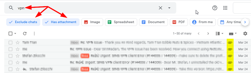 Tương tự, nếu bạn chỉ muốn tìm những email có file đính kèm, bạn chỉ cần chọn bộ lọc Has attachment. Bây giờ, những email không có file đính kèm đã biến mất.