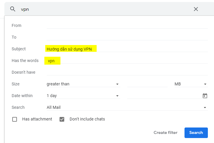 Thao tác trên sẽ kích hoạt khung tìm kiếm nâng cao cho phép bạn lọc kết quả với nhiều điều kiện hơn, chẳng hạn bạn có thể lọc theo tiêu đề của email, kích thước của chúng, và rất nhiều tùy chọn khác.