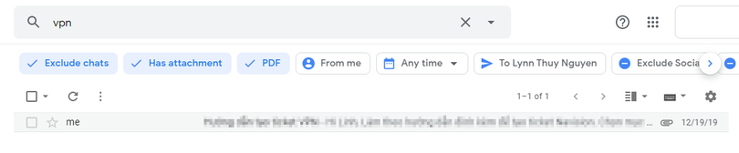 Điểm đặc biệt của Search Chips là khi bạn chọn bộ lọc Has attachment, nó sẽ cung cấp thêm các bộ lọc bổ sung cho phép bạn lọc loại file đính kèm trong email, chẳng hạn nếu chỉ muốn tìm email có file đính kèm là PDF, bạn chỉ cần chọn bộ lọc PDF. Như bạn có thể thấy trong hình dưới, sau khi chọn bộ lọc PDF, kết quả tìm kiếm bây giờ chỉ còn lại một email duy nhất. Như vậy chỉ với ba cú nhấp chuột, người viết đã tìm thấy email mình cần.