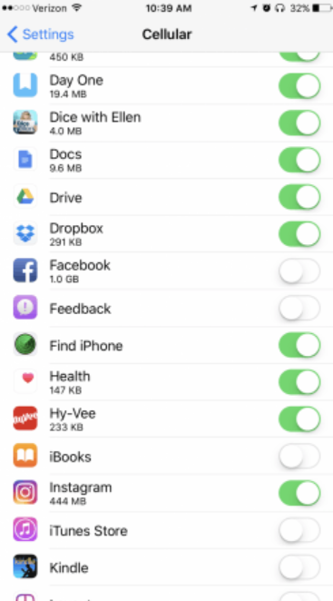 Bước 3: Di chuyển xuống dưới đến phần Cellular Data (Dữ liệu di động) và bạn sẽ thấy danh sách tất cả ứng dụng bạn đã cài đặt.