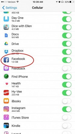 Như bạn thấy trong hình minh họa ở trên, chúng tôi đã sử dụng 1.0 GB dữ liệu của mình vào ứng dụng Facebook. Bây giờ, chúng tôi không muốn lãng phí dữ liệu vào ứng dụng này nữa. Bởi vậy, chúng tôi sẽ tắt công tắc nằm bên cạnh nó.