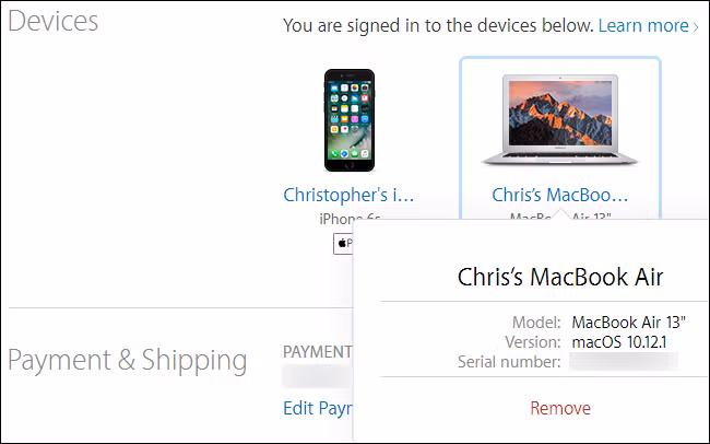 Nếu bạn đã liên kết tài khoản Apple ID của mình với máy Mac, số serial sẽ được đính kèm với tài khoản Apple ID đó. Hãy truy cập trang tài khoản Apple ID và đăng nhập bằng Apple ID bạn đã liên kết với máy Mac. Nhấp vào tên máy bên dưới mục Devices ở trang vừa mở ra và bạn sẽ thấy số serial của nó.