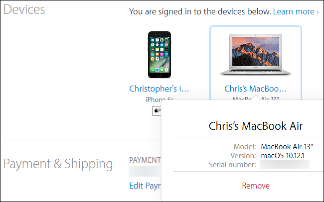 Nếu bạn đã liên kết tài khoản Apple ID của mình với máy Mac, số serial sẽ được đính kèm với tài khoản Apple ID đó. Hãy truy cập trang tài khoản Apple ID và đăng nhập bằng Apple ID bạn đã liên kết với máy Mac. Nhấp vào tên máy bên dưới mục Devices ở trang vừa mở ra và bạn sẽ thấy số serial của nó.