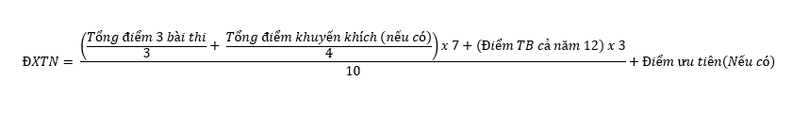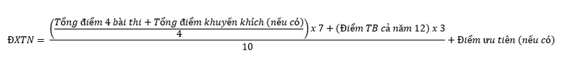 Hoặc, thí sinh B lựa chọn bài thi tổ hợp Khoa học Tự nhiên và điểm của các môn bắt buộc như sau: Văn 5, Toán 7, Lý 5, Hóa 4, Sinh 6. Thí sinh này có 1 điểm ưu tiên và không có điểm khuyến khích. Điểm trung bình cả năm lớp 12 là 6. Cách tính điểm của thí sinh B như sau: