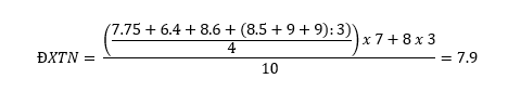 Ví dụ: Một thí sinh A đăng ký thi bài tổ hợp Khoa Học Xã Hội có các điểm thi thành phần cụ thể như sau: Văn: 7.75; Anh: 8.6; Toán: 6.4; Sử: 8.5; Địa: 9; GDCD: 9; điểm trung bình cả năm lớp 12 là 8. Như vậy, điểm của thí sinh A sẽ được tính như sau: