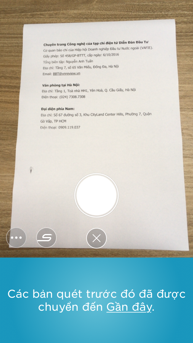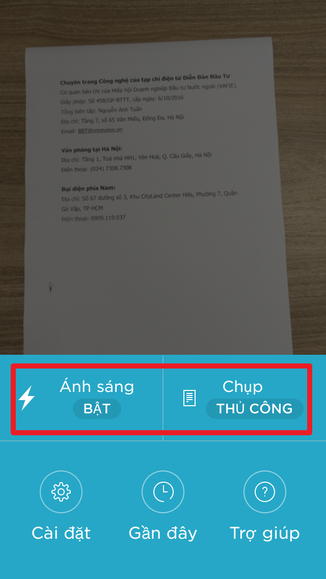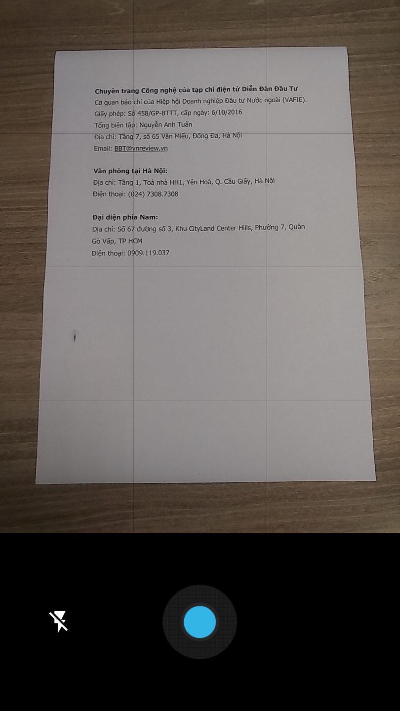 Tiếp theo, bạn canh chỉnh camera sao cho toàn bộ phần tài liệu cần scan nằm gọn trong màn hình điện thoại, sau đó bạn nhấn nút màu xanh ở chính giữa màn hình. Nếu máy của bạn có hỗ trợ đèn flash, bạn có thể bật nó để tăng sáng cho tài liệu cần scan. Để thực hiện, bạn nhấn nút hình tia chớp ở bên trái. Trường hợp, thiết bị của bạn không có đèn flash, nút này sẽ không xuất hiện.