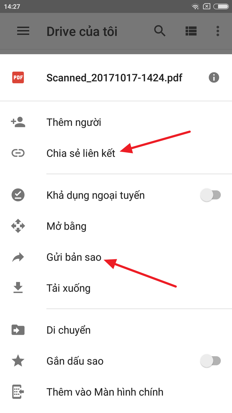 Bạn cũng có thể chọn tùy chọn Share Link (Chia sẻ liên kết) để chia sẻ file scan. Thao tác này sẽ chia sẻ đường dẫn (link) đến file scan trên Google Drive. Nếu muốn gửi file kết quả qua email hoặc upload nó lên các dịch vụ lưu trữ đám mây, bạn chọn tùy chọn Send a copy (Gửi bản sao).