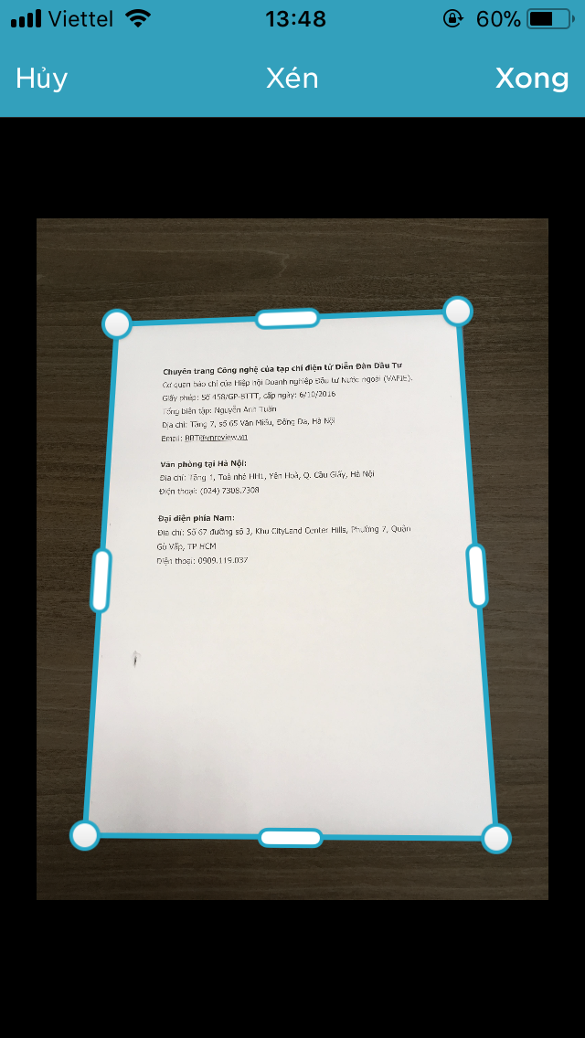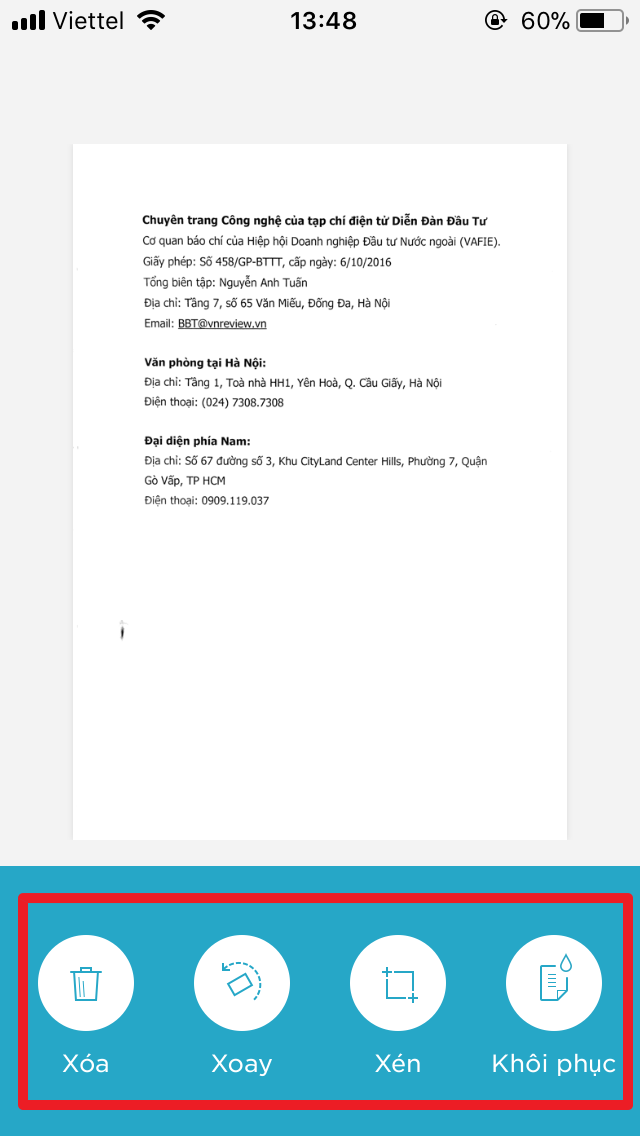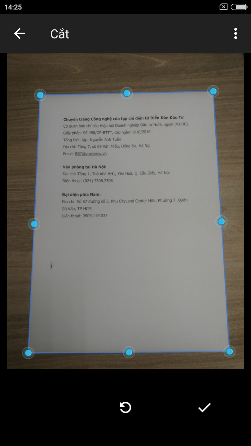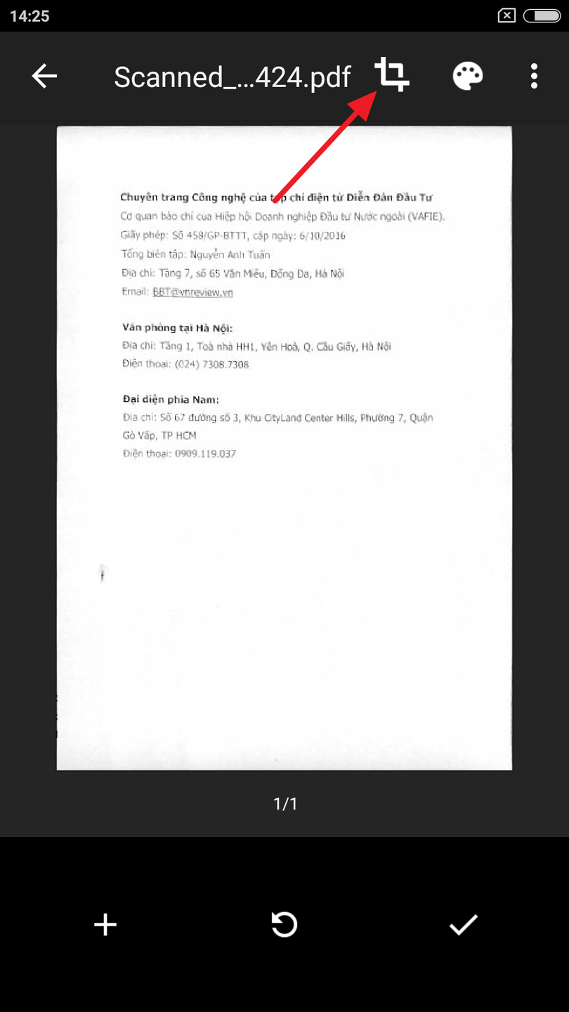 Sau khi scan tài liệu, màn hình xem trước sẽ xuất hiện ngay tức thời. Đừng lo lắng nếu bạn thấy tài liệu bị cắt xén, không hiển thị đầy đủ. Đây là nơi công cụ Crop (Cắt xén) phát huy vai trò. Bạn nhấn nút này và điểu chỉnh lại vùng cắt xén cho phù hợp.