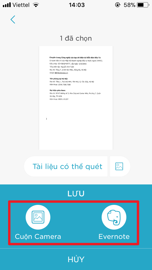 Bạn có thể chọn Camera Roll (Cuộn Camera) để lưu file kết quả vào thư viện ảnh của iPhone/iPad hoặc chọn Evennote để lưu nó vào dịch vụ Evernote. Nếu chọn lưu vào Evernote, bạn cần có tài khoản trên dịch vụ này.
