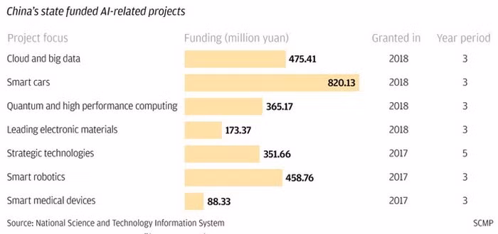 Hồ sơ công khai cho thấy Bộ Khoa học và Công nghệ Trung Quốc đã tài trợ ít nhất 8 dự án nghiên cứu liên quan đến AI trong 6 tháng qua với số tiền là 2,73 tỷ nhân dân tệ (10.000 tỉ đồng) từ ngân sách trung ương. Với khoảng thời gian quy chuẩn là 3 năm, chưa kể đến "các công nghệ mang tính cách mạng", các dự án bao phủ nhiều chủ đề khác nhau, từ dữ liệu lớn và tính toán hiệu suất cao cho đến các lĩnh vực tiên phong hơn, chẳng hạn như gắn chip vào nội tạng người.