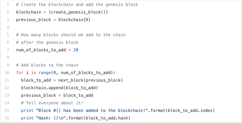 Đó là phần lớn mảng công việc khó khăn. Bây giờ, chúng ta đã có thể tạo ra blockchain! Trong trường hợp này, blockchain chính là một danh sách Python đơn giản. Phần tử đầu tiên chính là block đầu tiên. Và tất nhiên, chúng ta cần thêm các block kế tiếp. Bởi vì SnakeCoin là blockchain ngắn gọn nhất, chúng ta sẽ chỉ thêm 20 block mới. Chúng ta có thể làm điều này theo một vòng lặp.