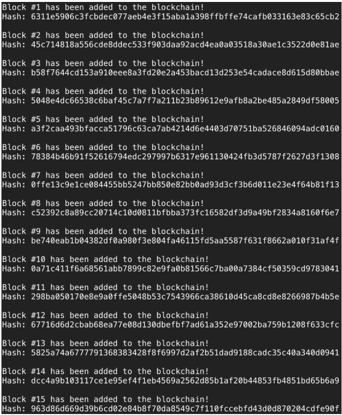 Và ở đây, blockchain này đã hoạt động. Nếu bạn muốn xem thêm thông tin, bạn có thể điều chỉnh file nguồn và in mỗi dấu mốc thời gian hoặc dữ liệu của mỗi block.