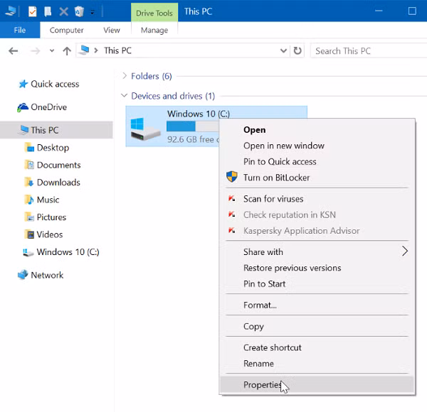 Bước 1: Mở File Explorer, chọn This PC, nhấp chuột phải vào ổ đĩa Windows 10 được cài đặt và sau đó chọn Properties.