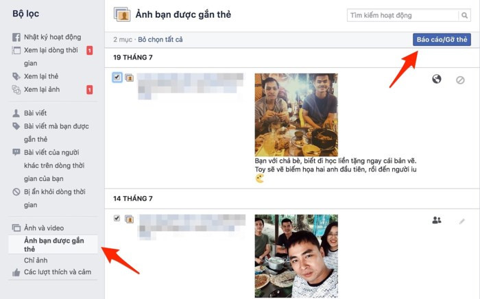 Đối với những hình ảnh được tag, bạn chỉ có thể gỡ tag chứ không thể xóa bài viết. Để thực hiện, bạn cần truy cập vào Activity Log (nhật kí hoạt động), sau đó nhấp vào mục Photos You’re tagged in (ảnh bạn được gắn thẻ). Chọn các bài viết cần gỡ tag rồi nhấn Remove tag (gỡ thẻ). Lưu ý, bạn chỉ có thể chọn 10 ảnh cùng một lúc. Thực hiện tương tự đối với các bài viết được gắn thẻ.