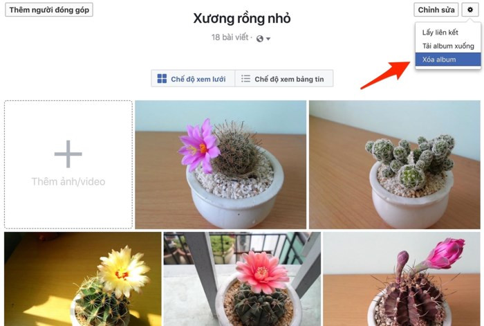 Đầu tiên, bạn hãy truy cập vào trang Facebook cá nhân, chọn mục Photos (ảnh) > Albums. Chọn album bạn muốn xóa, nhấp vào biểu tượng bánh xe răng cưa ở góc phải bên trên và chọn Delete album (xóa album).
