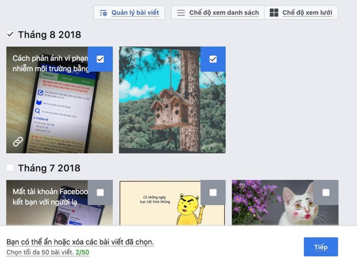 Về cơ bản, Facebook cũng hỗ trợ người dùng xóa các bài viết cũ, hình ảnh được gắn thẻ thông qua mục Manage Posts (quản lý bài viết) trên trang cá nhân. Tuy nhiên, tính năng này khá hạn chế vì chỉ xóa được tối đa 50 mục một lần.