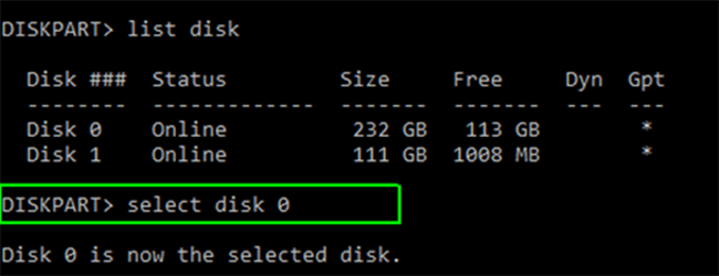 Sau khi Diskpart hiển thị danh sách ổ cứng vật lý, bạn nhập lệnh select disk và con số tương ứng với ổ cứng mình muốn chọn. Ví dụ, để chọn ổ cứng có dung lượng 232GB như hình dưới, câu lệnh tương ứng sẽ là select disk 0