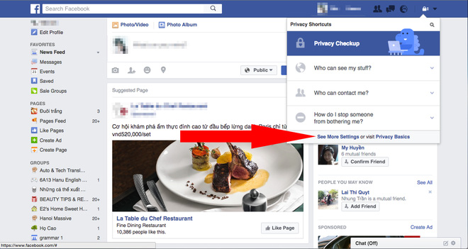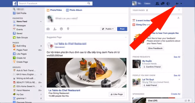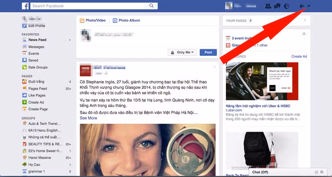 1. Trước tiên là cách "giải quyết" việc theo dõi quảng cáo: Click vào mũi tên đi xuống ở phía trên bên phải trangFacebook