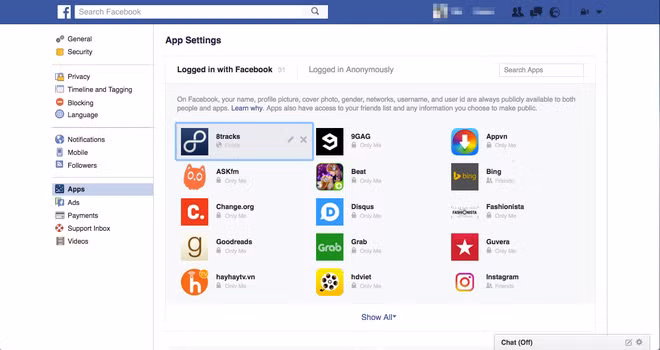 12. Người dùng có thể tuỳ chỉnh ở mỗi ứng dụng hoặc xoá nó hoàn toàn để ứng dụng đó không thể truy cập vào tài khoản Facebook của mình nữa
