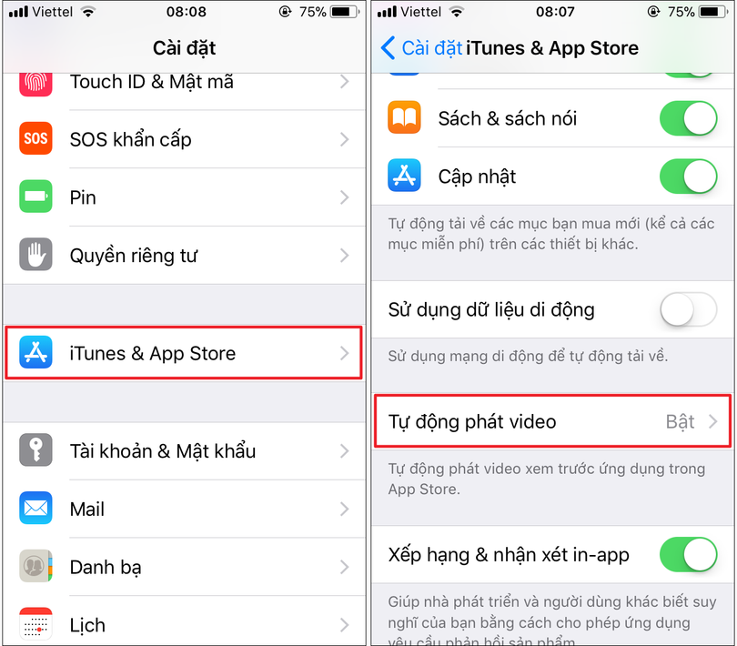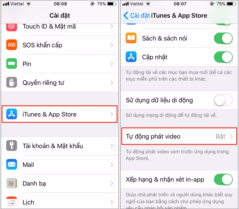 Truy cập vào Settings (Cài đặt) > iTunes & App Store > Video Autoplay (Tự động phát video) > chọn Off (Tắt).