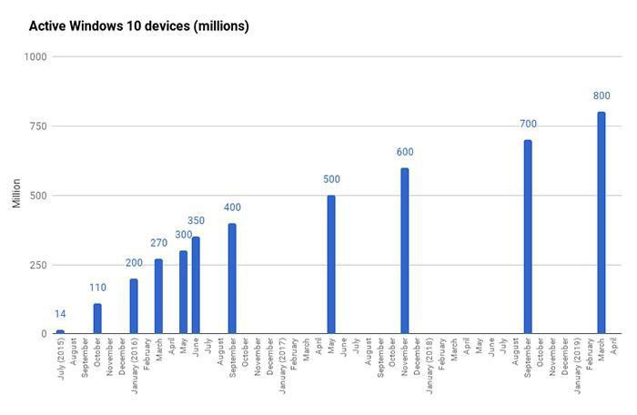 Số thiết bị sử dụng Windows 10 hiện đã đạt 800 triệu, tăng nhanh trong nửa năm qua. Ảnh: Zdnet.