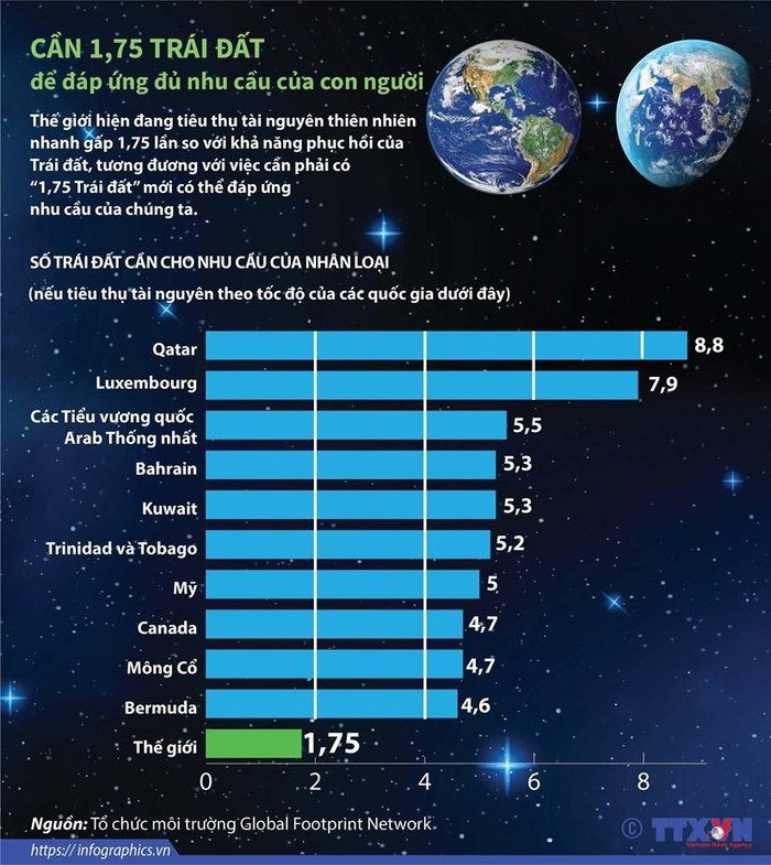 Thế giới hiện đang tiêu thụ tài nguyên thiên nhiên nhanh gấp 1,75 lần so với khả năng phục hồi của Trái đất , tương đương với việc cần phải có “1,75 Trái đất” mới có thể đáp ứng nhu cầu của con người./.