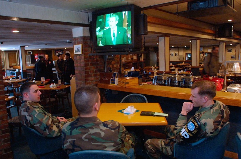Trại Bonifas, nơi đóng quân của quân đội Liên hợp Quốc cũng gần Bàn Môn Điếm. Trong bức ảnh năm 2003, các binh sĩ Mỹ đang xem Tổng thống George W.Bush đọc diễn văn.
