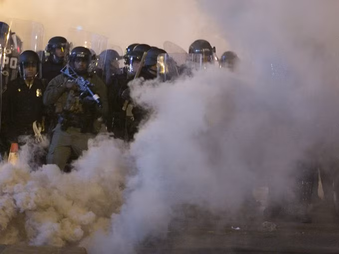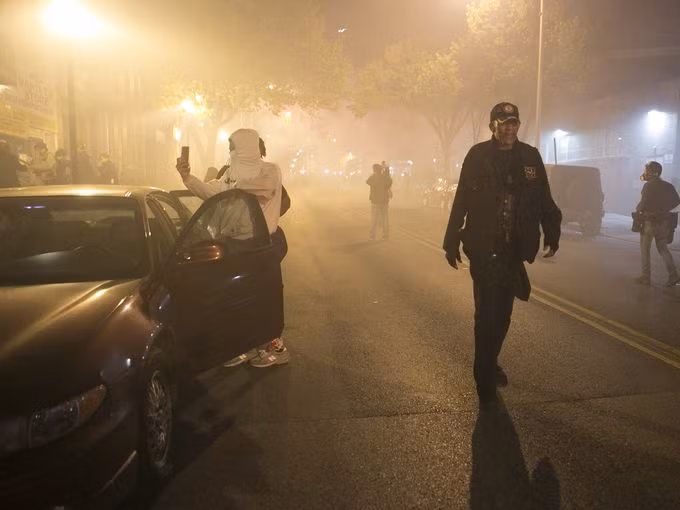 Cựu chiến binh Việt Nam Robert Valentine rời khỏi ngã tư, nơi cảnh sát sử dụng lựu đạn khói và hơi cay để giải tán đám đông
