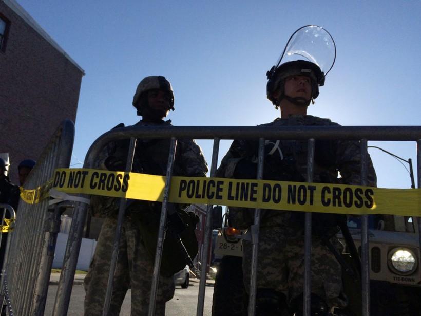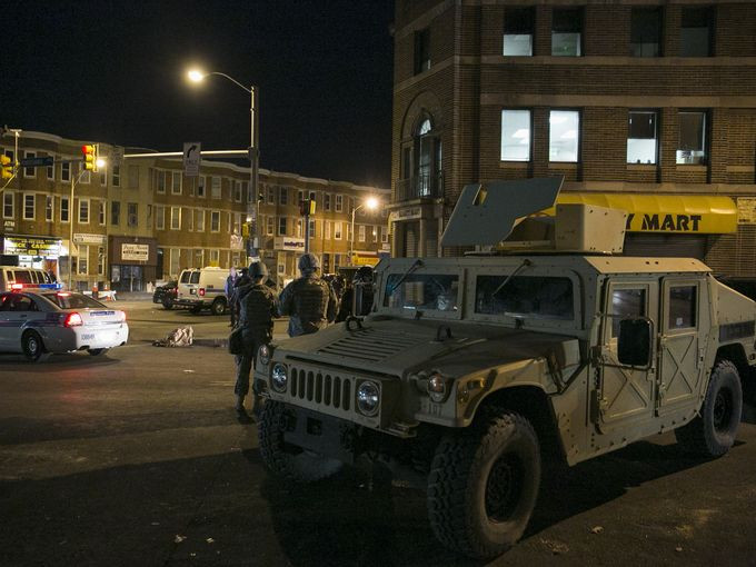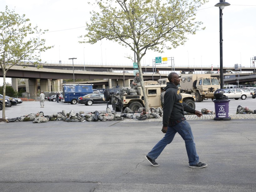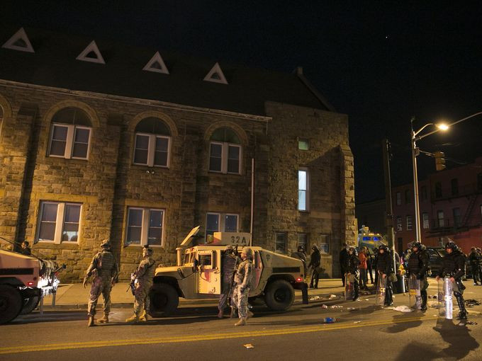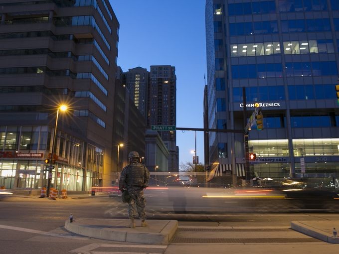 Binh lính của đơn vị 200 Cảnh sát quân sự Lực lượng vệ binh quốc gia Maryland bảo vệ và thực thi lệnh giới nghiêm tại vị trí của bạo loạn trước đó ở Baltimore