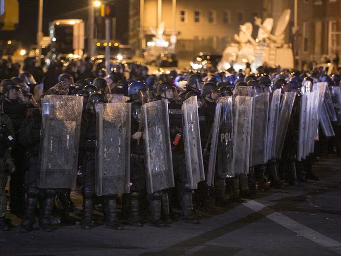 Những cảnh sát chống bạo động với trang thiết bị đang chuẩn bị tiến lên giải tán đám đông ở Baltimore