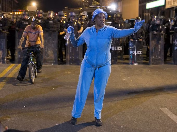 Cư dân khu phố đứng trước mặt cảnh sát chống bạo trong khu vực bạo loạn trước đó ở Baltimore, Md., Thứ Ba 28.04, 2015.