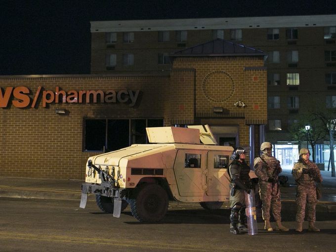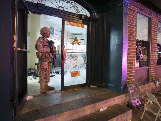 Sgt. DS Dickerson, một binh sĩ thuộc đơn vị Cảnh sát số 200 (200th Military Police Company) thuộc lực lượng Vệ binh quốc gia Maryland National Guard's đứng trước một cửa hàng bị tàn phá ở Baltimore, Md., Ngày Thứ tư, 29.04.2015. Thống đốc Maryland Larry Hogan đã khởi động lực lượng Vệ binh sau khi bạo loạn bùng lên từ đám tang của Freddie Gray, chết trong trại giam.