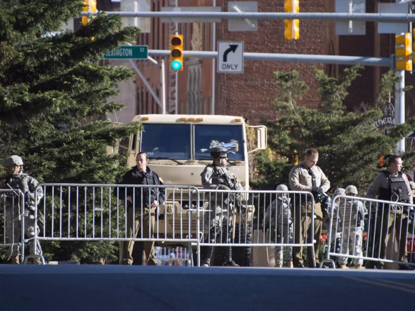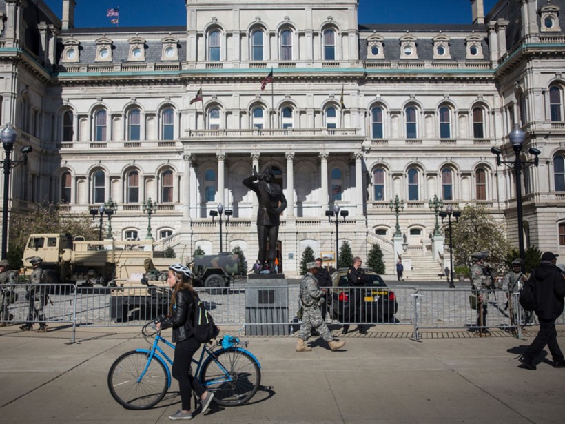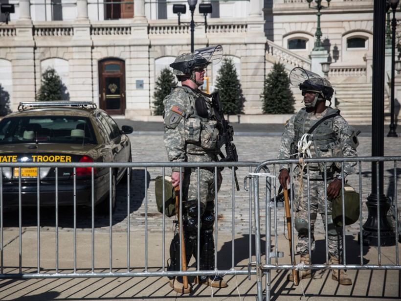 Cảnh sát và binh sĩ vệ binh quốc gia đứng canh gác bên ngoài City Hall