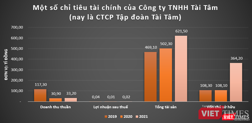 Theo dữ liệu của VietTimes, tính đến ngày 31/12/2021, tổng tài sản của Tài Tâm Group đạt mức 621,5 tỉ đồng, tăng 23,73% so với cuối năm 2020 và tăng 32,49% so với thời điểm cuối năm 2019.