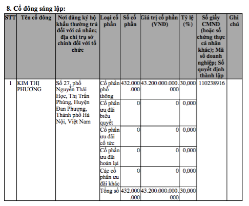 Tên người đại diện theo pháp luật là Trần Gia Phong, sinh năm 1979. Công ty này có 3 cổ đông, bao gồm ông Trần Gia Phong và bà Kim Thị Phương mỗi người góp 30%, tương ứng 43.200 tỷ đồng cùng ông Nguyễn Hoàn Sơn góp 40%, tương ứng 57.600 tỷ đồng.