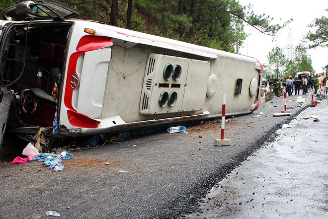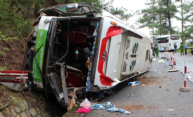 Chiếc ôtô Lê Mỹ lật nghiêng vào vách núi, biến dạng phần đầu. Thời điểm xảy ra tai nạn, trên xe có hơn 45 người, chủ yếu là khách Bình Dương đi tour du lịch Đà Lạt vào tối 17/6.