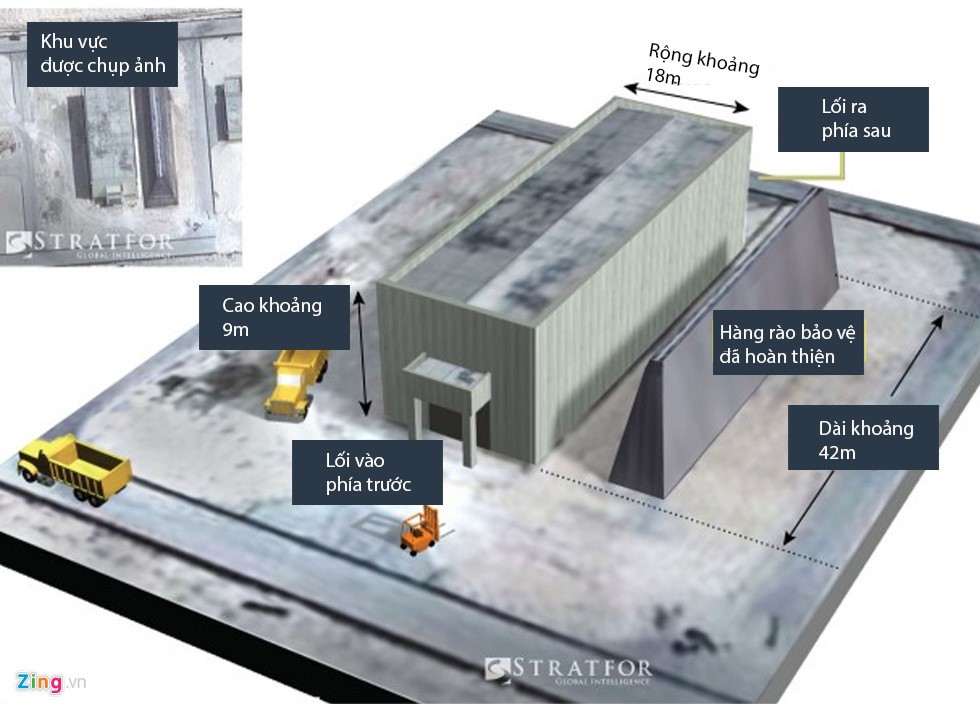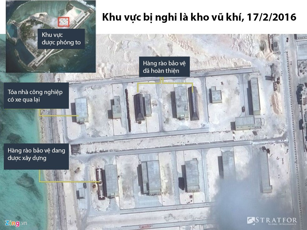 Tòa nhà được cho là kho vũ khí, có xe qua lại với hàng rào bảo vệ đã hoàn thiện được một phần và đang tiếp tục được xây dựng. Ảnh chụp ngày 17/2. Trước thông tin Trung Quốc xây dựng căn cứ trực thăng quân sự trên đảo Quang Hòa và bố trí tên lửa đất đối không HQ-9 trên đảo Phú Lâm thuộc quần đảo Hoàng Sa của Việt Nam, ngày 19/2, người phát ngôn Bộ Ngoại giao Lê Hải Bình nhấn mạnh đây là những hành động xâm phạm nghiêm trọng chủ quyền của Việt Nam đối với quần đảo Hoàng Sa, đe dọa hòa bình và ổn định trong khu vực cũng như an ninh, an toàn, tự do hàng hải và hàng không ở Biển Đông.