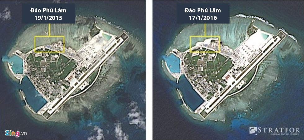 Toàn cảnh đảo Phú Lâm thuộc quần đảo Hoàng Sa của Việt Nam trong ảnh vệ tinh do DigitalGlobe chụp ngày 17/2 vừa qua. Ảnh cho thấy rõ đê chắn sóng đã được cải thiện, các tòa nhà đang được xây dựng, khu đất mới bồi lấp và đường băng đã được mở rộng. Ngày 18/2, Hoàn cầu Thời báo dẫn nguồn tin của Bộ Quốc phòng Trung Quốc xác nhận nước này "đã triển khai vũ khí tới đảo Phú Lâm từ lâu". Tuy nhiên, tờ này không nói rõ về loại vũ khí và còn lớn tiếng nói rằng truyền thông phương Tây dường như đang thổi phồng về "mối đe doạ Trung Quốc".