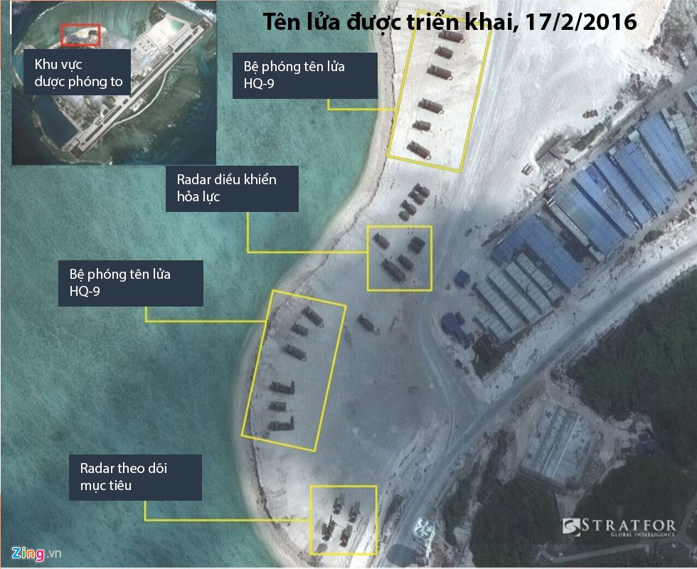 Phần khoanh vàng là khu vực mới được Trung Quốc mở rộng trong hơn 2 tháng qua. Đây chính là địa điểm bố trí các tên lửa HQ-9, động thái mà các chuyên gia nhận định là vô cùng nguy hiểm, uy hiếp các máy bay quân sự cũng như dân sự. Các quan chức Mỹ lên tiếng cho hay, việc Trung Quốc triển khai tên lửa đất đối không tới đảo Phú Lâm của Việt Nam làm phức tạp tình hình Biển Đông. Họ cũng khẳng định, nó không ảnh hưởng tới các chuyến tuần tra Biển Đông do Washington tiến hành.