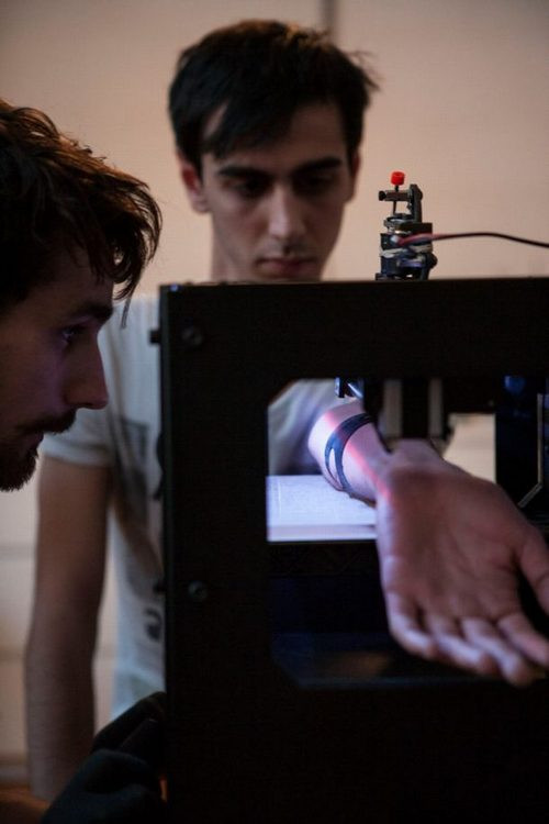 Theo Motherboard, hai nhà thiết kế người Pháp Pierre Emm và Johan da Silveira đã hợp tác với kỹ sư Autodesk, David Thomasson tạo ra mẫu robot có khả năng xăm quy mô công nghiệp đầu tiên trên thế giới.