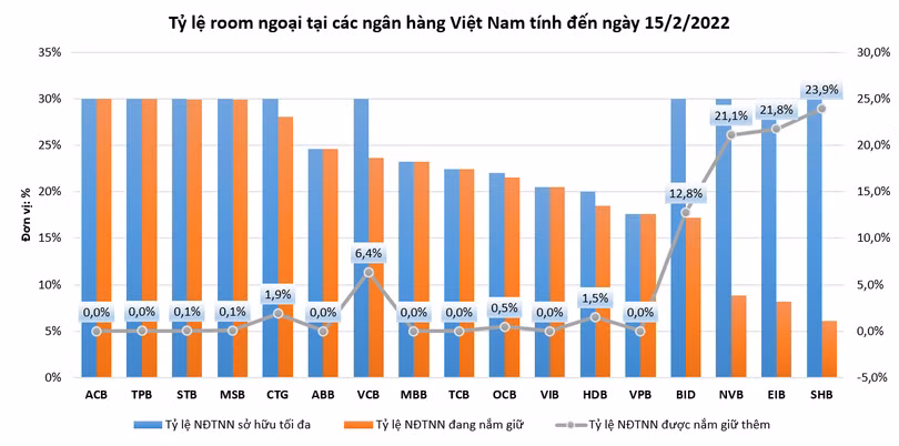 Số liệu cập nhật ngày 15/2 của Trung tâm Lưu ký Chứng khoán Việt Nam (VSD) cho thấy, tỷ lệ sở hữu của nhà đầu tư nước ngoài (“room” ngoại) tại nhiều ngân hàng Việt Nam đã chạm trần.