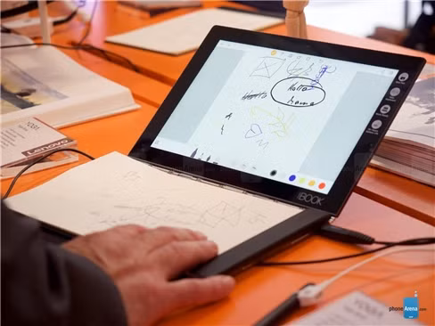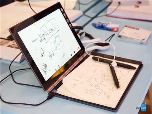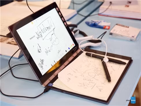 Không chỉ giới hạn ở khả năng mang lại một giao diện bàn phím cảm ứng hiện đại và cũng không kém phần chuyên nghiệp – giao diện phần đế đặc biệt của Lenovo Yoga Book còn là một lựa chọn tốt cho nhu cầu ghi chú trong các buổi họp bàn công việc quan trọng. Với Lenovo Yoga Book người dùng có thể ghi lại thông tin quan trọng lên giấy (đặt trực tiếp trên bề mặt đế của chiếc tablet này) bằng bút thông thường, Lenovo Yoga Book sẽ ngay lập tức số hóa những thông tin mà người dùng đã ghi lại trên giấy. Ngoài ra, với bút cảm ứng có thể phân biệt đến 2.048 mức độ khác nhau của lực nhấn, người dùng còn có thể hô biến giao diện bàn phím cảm ứng thành một bảng vẽ để tự do sáng tác, vẽ vời như những họa sĩ chuyên nghiệp với bút màu và giấy vẽ truyền thống.