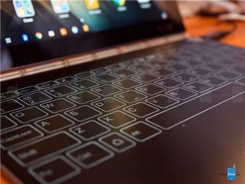 Qua những hình ảnh thực tế, có thể nhận thấy phần đế của Lenovo Yoga Book thoạt trông như một nắp đậy với mặt trong thiết kế bóng bẩy như gương. Tùy vào nhu cầu sử dụng mà phần đế này có thể dùng như một bàn phím ảo với layout gần gũi và quen thuộc tựa như các dòng máy tính xách tay mà Lenovo từng giới thiệu.