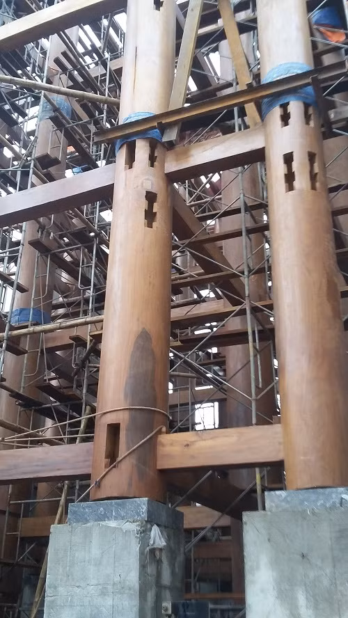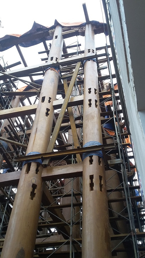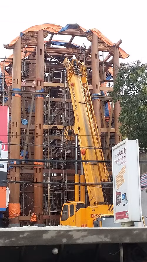 Do sử dụng nhiều cột gỗ lớn và dài nên đơn vị thi công đã phải huy động máy cẩu để đưa gỗ lên.